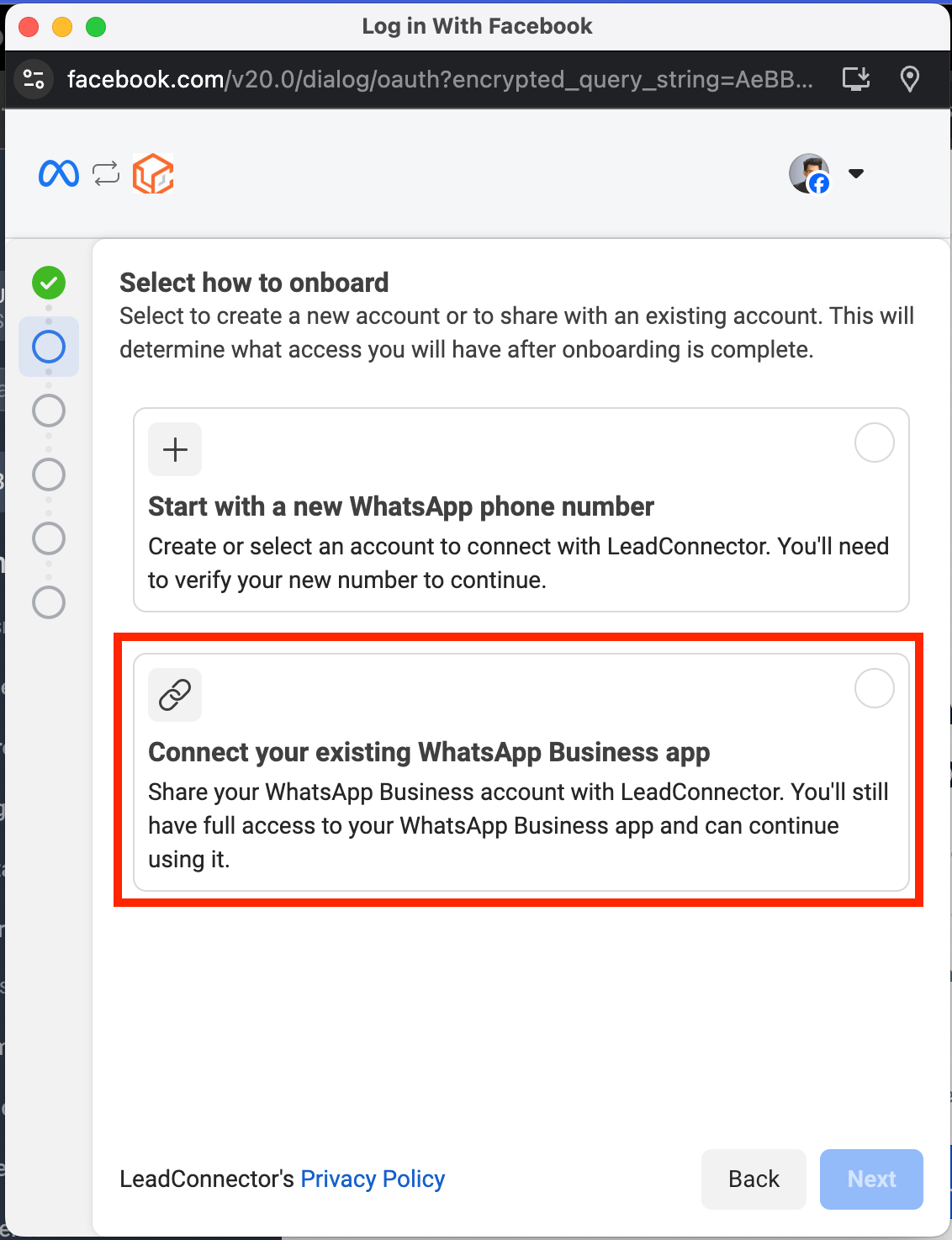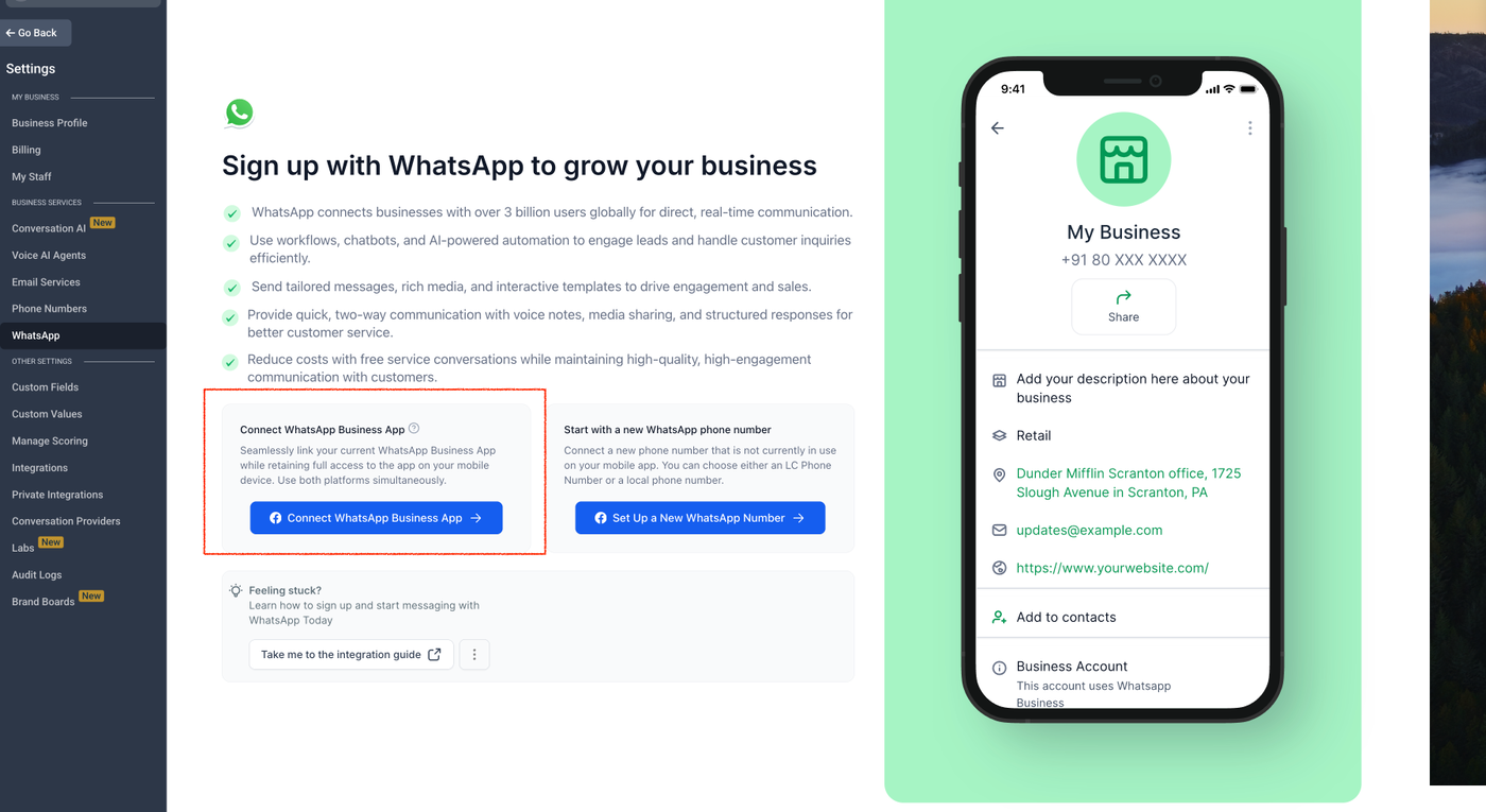 • Conecta tu cuenta existente de WhatsApp Business con LeadConnector.