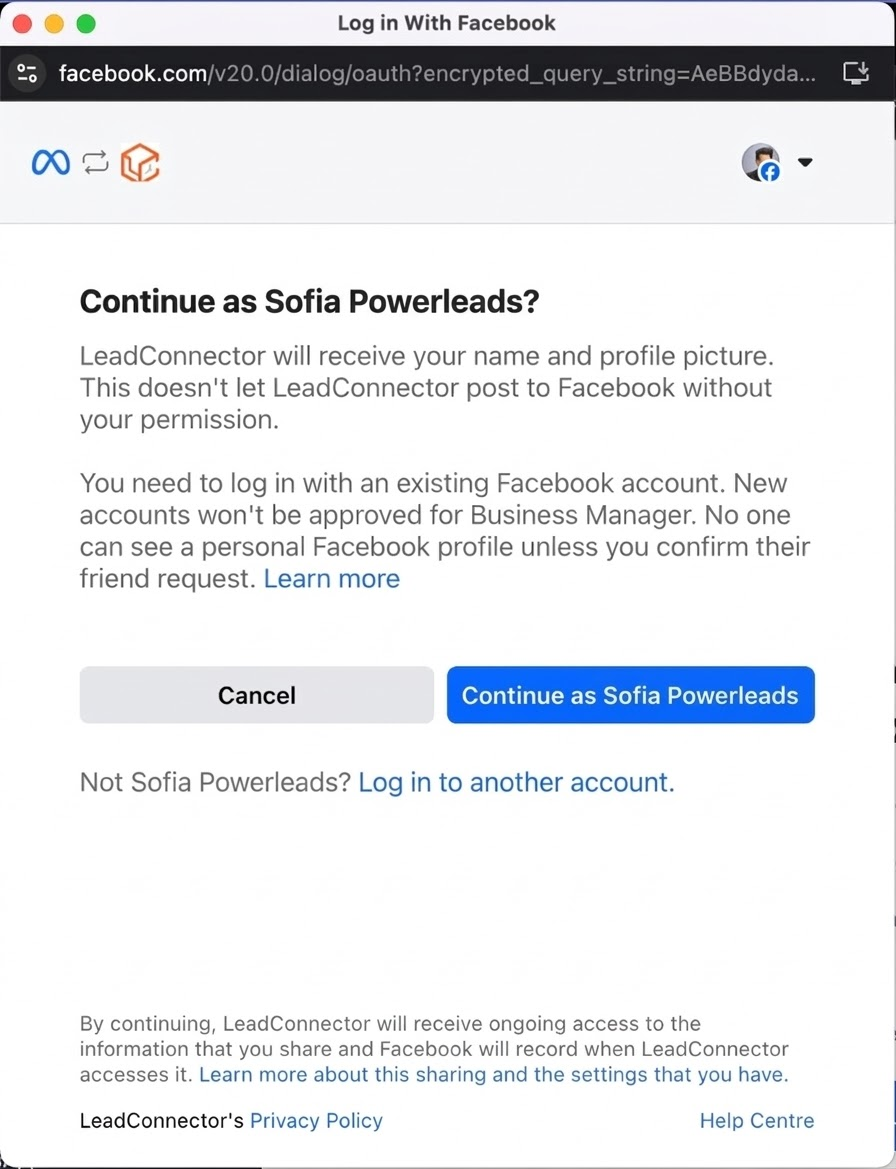 Esto significa que durante el proceso de conexión verás el nombre LeadConnector, pero todo quedará conectado directamente dentro de PowerLeads.
