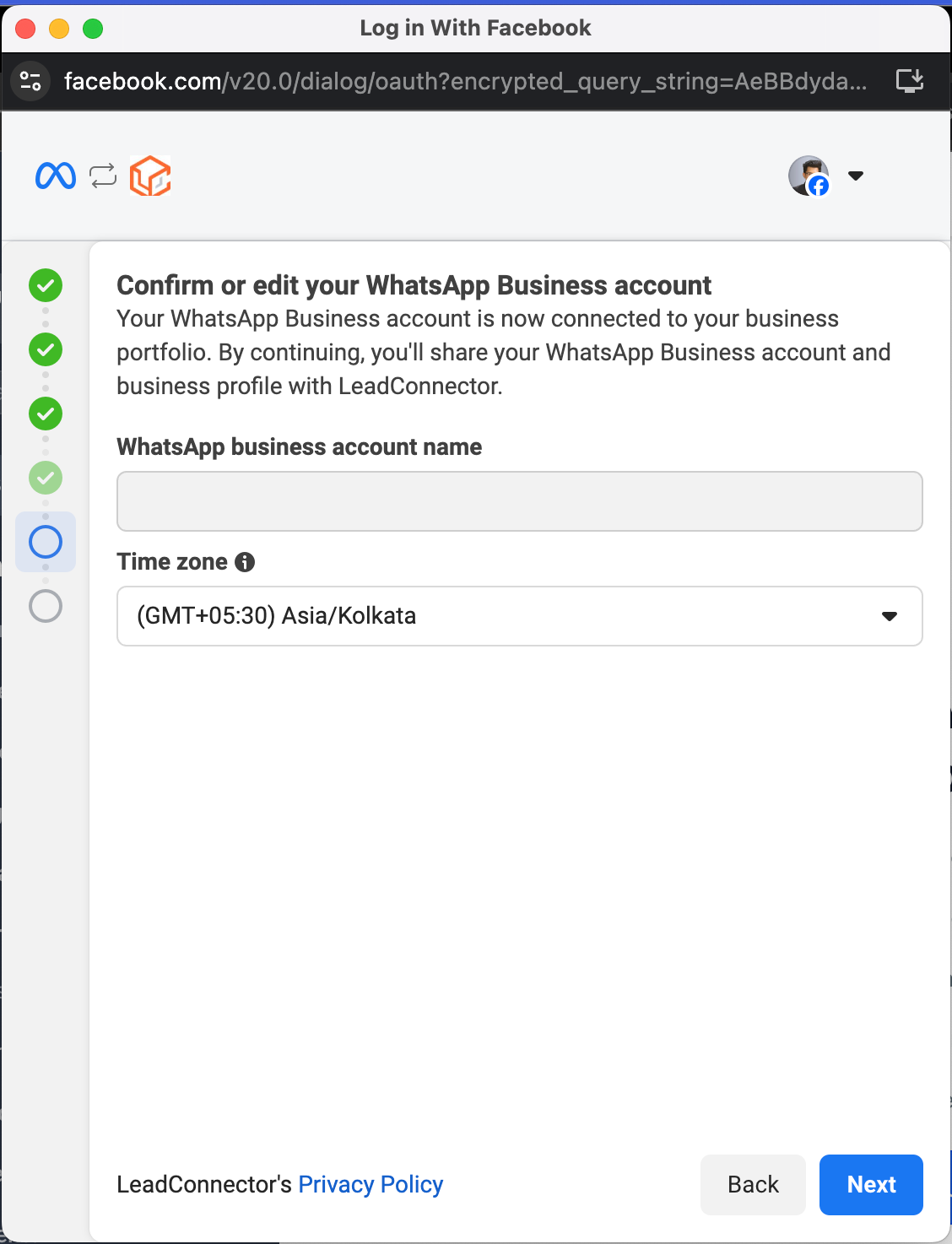 Paso 6: Confirmar la conexión de WhatsApp Business App dándole click al botón siguiente