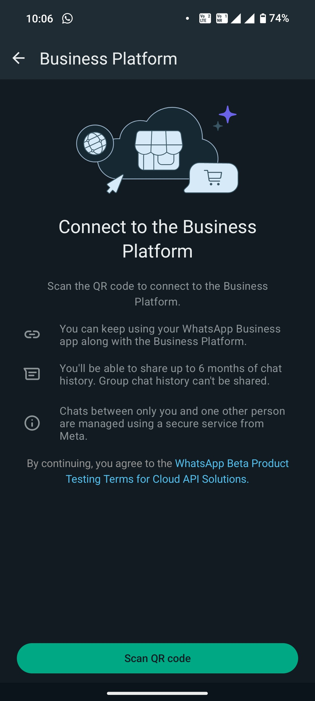 • Te llegará un mensaje de la cuenta oficial de negocios de Facebook a la aplicación de whatsapp en el celular, deberás escanea el código QR.